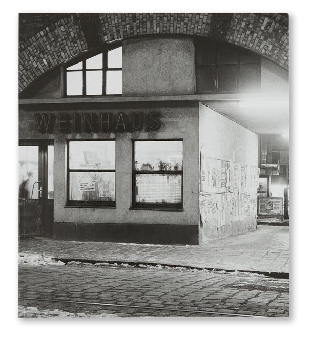 Leo Kandl (geb. 1944) fotografierte für sein Langzeitprojekt, das in den Jahren 1977-1984 entstand, in verschiedenen Kneipen. Nicht nur in Wien, wie der Titel des Textes von Monika Faber „Wiener Runden“ nahelegt. Dieser Essay ist im Anschluß an den Bildteil abgedruckt und seine Überschrift dient der Buchhandelsausgabe als Titel auf dem Schutzumschlag. Der eigentliche Buchtitel lautet aber „Weinhaus“. Und auf der in dieser Hinsicht besonders schön gestalteten, broschierten Museumsausgabe ist der Name des Buches durch die Beschriftung des Gebäudes auf der abgebildeten Fotografie präsent. Das erspart die sonst übliche, zusätzliche Typographie auf der Einbandvorderseite.