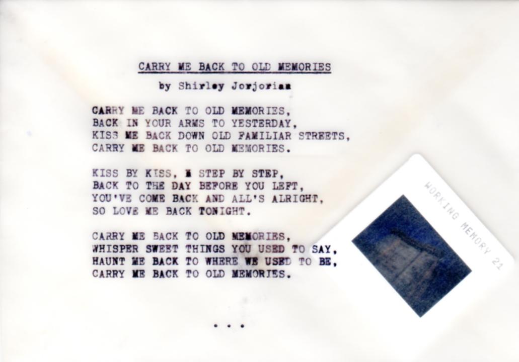 Und dann geht es doch noch weiter, man findet einen in die Mappe eingelegten transparenten Umschlag, der ein Diapositiv enthält. Beschrieben ist dieser Umschlag mit einem Gedicht von Shirley Jorjorian, das ihre Sehnsucht nach Erinnerung, Nähe und Berührung sehr schön ausdrückt. Viel hinzuzufügen ist dem nicht mehr.