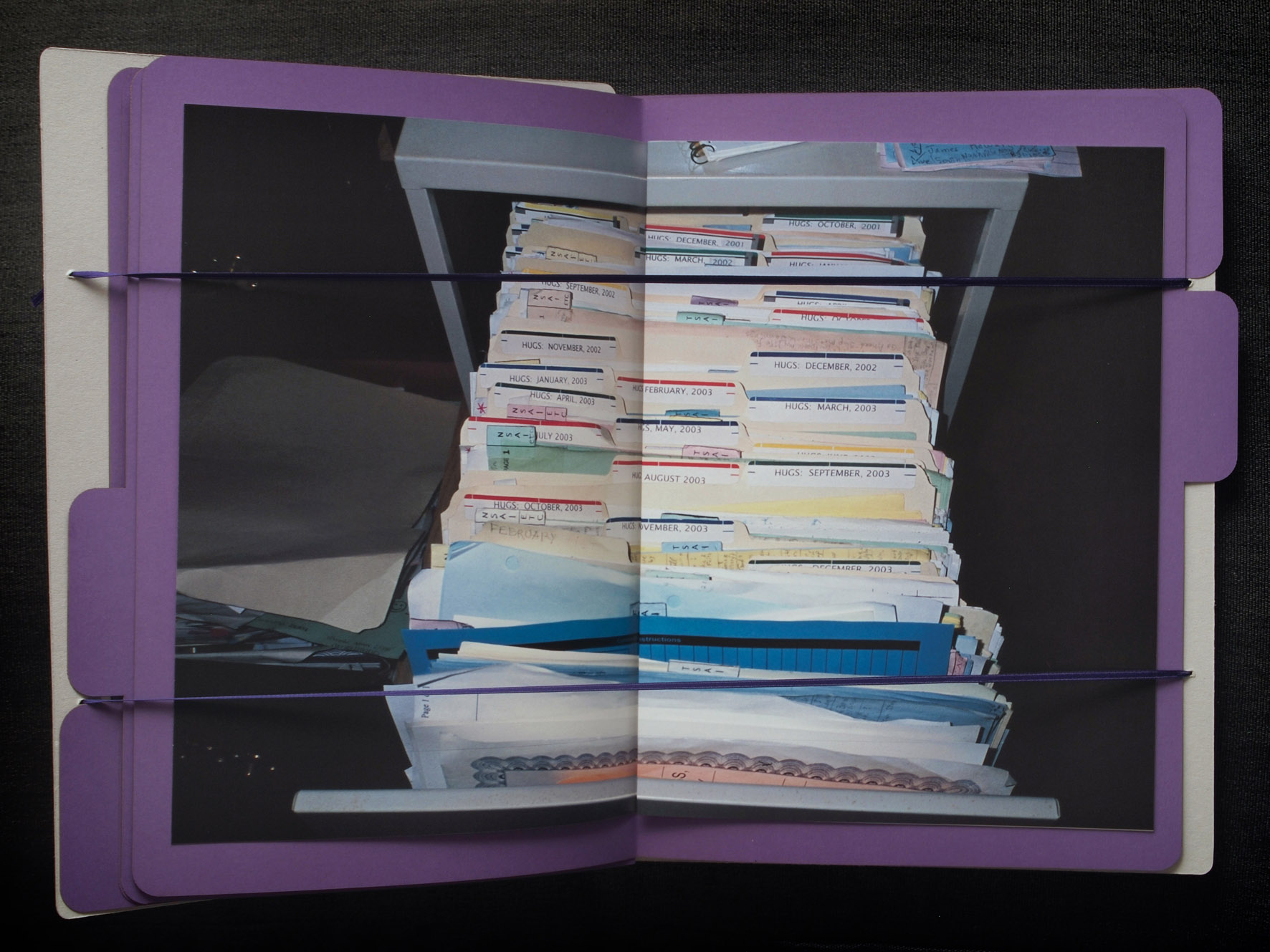In der dritten Mappe schildern die Bilder und reproduzierten Blätter Shirleys Hug-Projekt. Auf den Seiten von YouTube kann man sich selber einen Einblick in ähnliche Projekte verschaffen (z.B. hier: http://www.youtube.com/watch?v=vr3x_RRJdd4 ). Shirley hat darüber richtiggehend Buch geführt und jede Umarmung akribisch vermerkt. Sogar diejenigen, die im Traum erfolgt sind. Das mag zunächst merkwürdig erscheinen, eine eigentlich spontane Geste zur Grundlage einer Sammlung von Karteikarten zu machen. Aber auch hier spielt das Bedürfnis nach Erinnerung eine Rolle und vielleicht auch die ziemlich menschliche Leidenschaft des Sammelns.