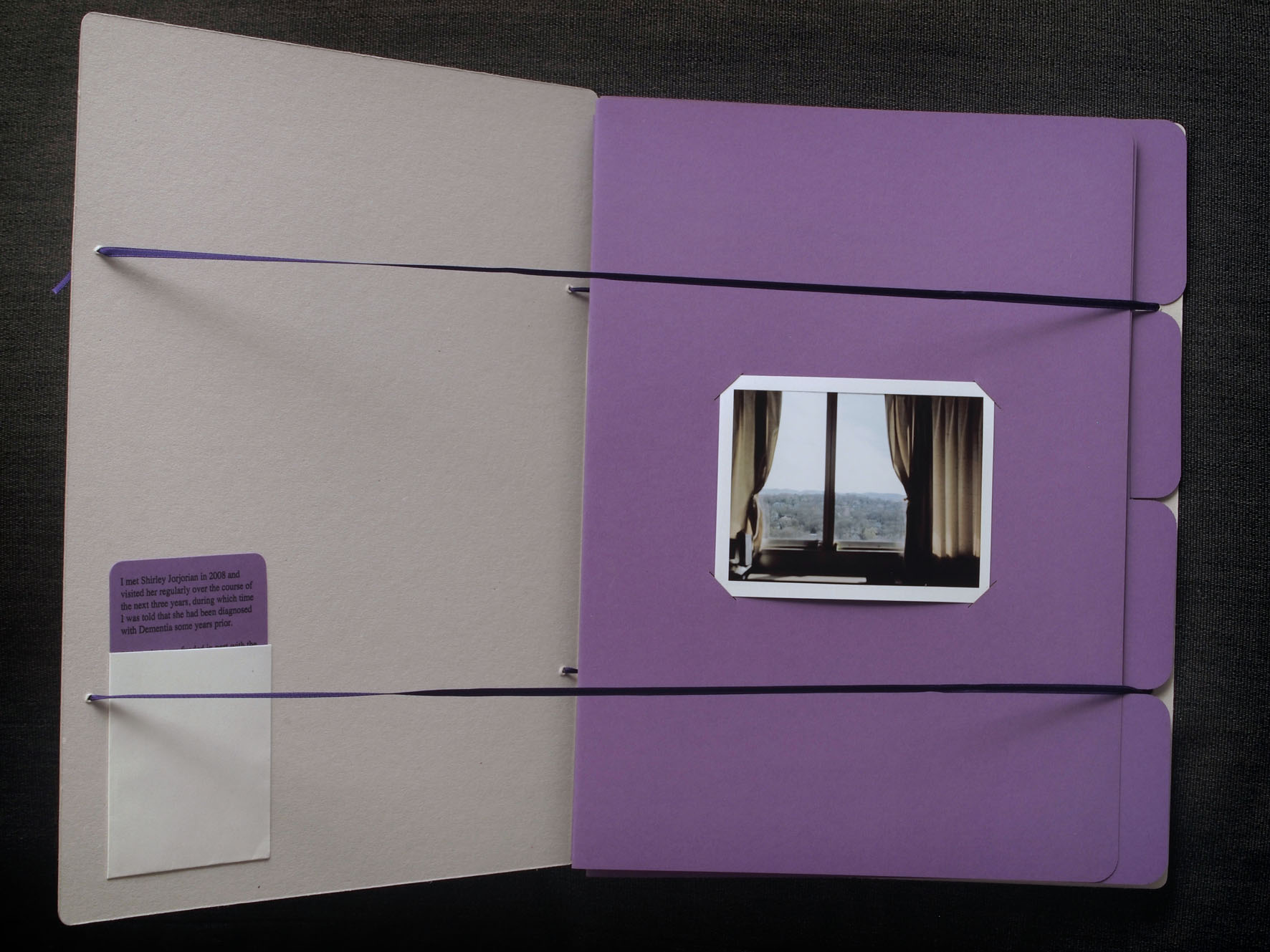 Die Bilder der nächsten Mappe führen uns ins Innere von Shirleys Wohnung. Wir entdecken Karteikarten und Notizzettel. Aber auch Plüschtiere auf der Lehne eines Sofas, ein mit Videos und Büchern gefülltes Regal oder den Zettel mit der Auflistung der Medikamente Shirleys. Und es tauchen ihre Hände auf, welche die Fernbedienung des Fernsehers halten. Was es mit den Karteikarten und Notizzetteln auf sich haben könnte, erschließt sich durch die Vorbemerkung Jim Reeds, die sich auf einer in die Rückseite des vorderen Umschlags eingesteckten kleinen Karte befindet. Bei Shirley Jorjorian wurde eine Demenz diagnostiziert. Und das erklärt auch die Texte zu Beginn jeder Einzelmappe, die aus einem Manual zur Diagnostik von Demenzerkrankungen stammen.