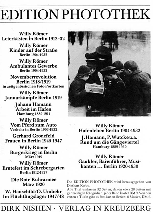 Erschienen ist „Das Auge des Gewissens“ als Band 6 der Reihe „Das Foto-Taschenbuch“ im Dirk Nishen Verlag in Berlin. Weitere Bände dieser Reihe lassen sich aus den unten angefügten Bilddateien ersehen. Vor allem in den 1980er Jahren war dieser Verlag im Bereich Fotografie ziemlich aktiv. Am bekanntesten dürfte vielleicht das Buch „Waffenruhe“ von Michael Schmidt geworden sein, das es in den Kanon von Parr und Badger geschafft hat. Eine weitere populäre Reihe des Verlags war die Edition Photothek. Die ins Buch eingelegte und hier abgebildete Werbe-Postkarte listet ein paar der dort erschienenen Bände auf.